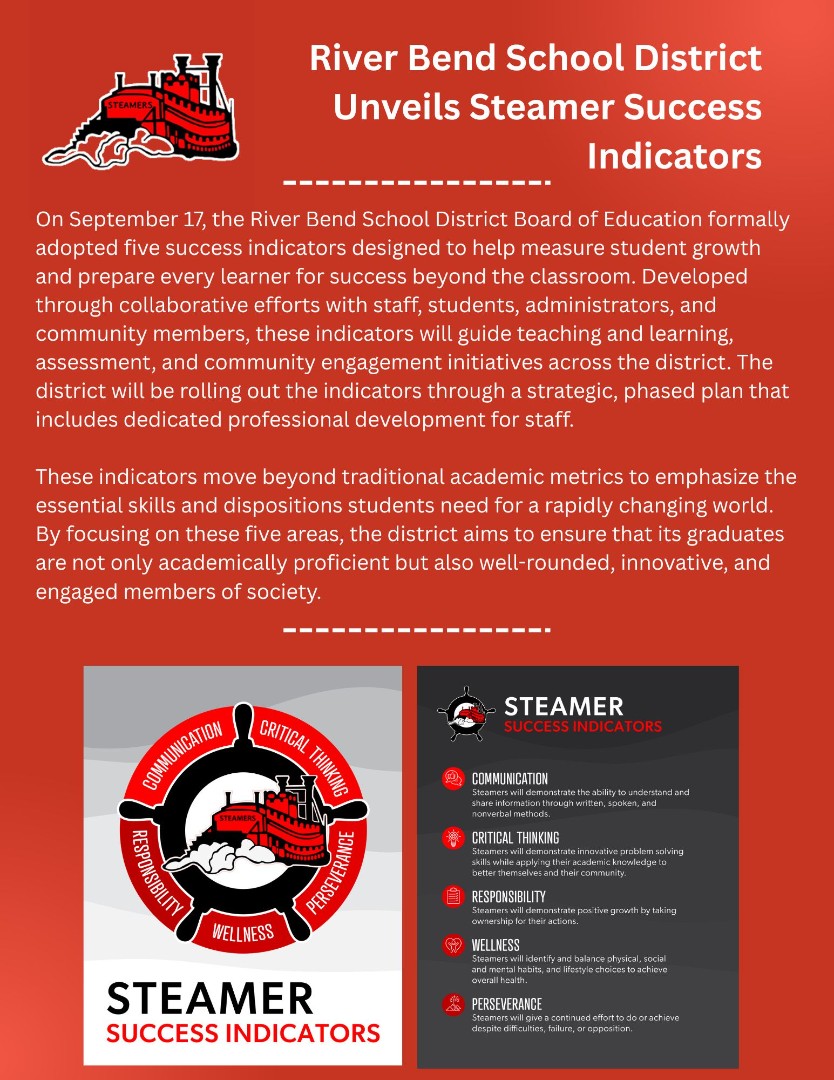 We're excited to announce a new initiative at the River Bend School District! On September 17, our School Board formally adopted five Steamer Success Indicators to help measure and support your child's growth.